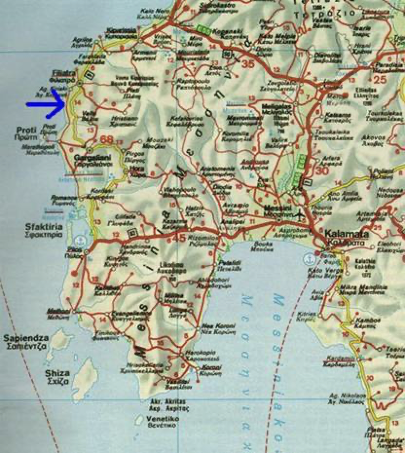 Dopo aver visitato Olimpia se si vuole un itinerario più costiero ,prendete la strada per Pilos, la strada è litoranea e costeggia numerose spiagge per eventuali soste. Ma arrivati a Filiatra conviene prendere la strada per Marathopoli che passa sulla costa,perché la strada principale sale sulle montagne ed è tutta una curva. La strada litoranea è una strada secondaria ,passa dentro i paesini ,e in mezzo alle coltivazioni ma è asfaltata e si percorre più facilmente. Poi la strada si ricongiunge a quella principale per Pilos