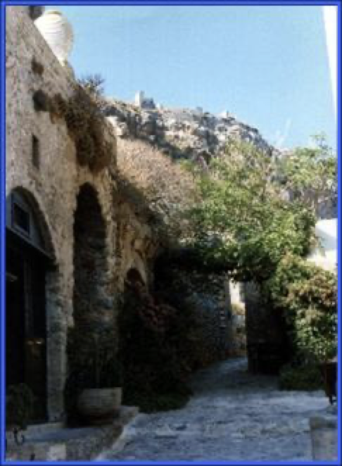 Ma entrando dalla porta principale del Kastro, come è chiamato il paese, si scopre un mondo a parte dove si può solo andare a piedi. Tutto è curatissimo con negozi di gioielli , gallerie d’arte ,ristoranti sulle terrazze che guardano il mare, i bar che diffondono musica, nei vicoli bouganvillee spuntano dai ruderi delle case, e gradini consumati dal tempo salgono verso la rocca.
