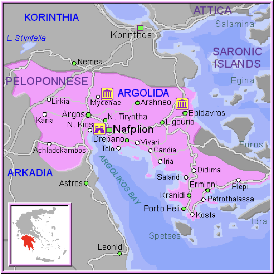 È all’interno della verdeggiante regione dell’Argolide (venendo da Atene è la prima penisola del Peloponneso che si incontra e che separa il golfo Saronico dal golfo Argolico), che si concentrano