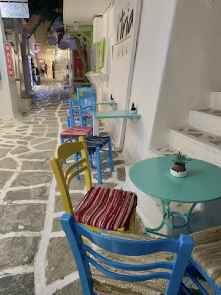 Passeggiamo tra panchine in pietra calcarea, edifici di architettura cicladica, ammitando le bouganville presente in quasi tutte le case e varie altre piante e fiori.